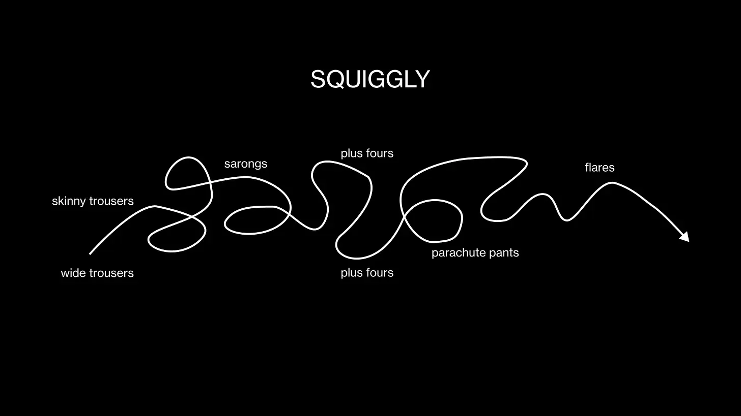 Remember Brand’s diagram? Remember that squiggly line for fashion? It’s all about the seemingly nonsensical path that fashion takes.